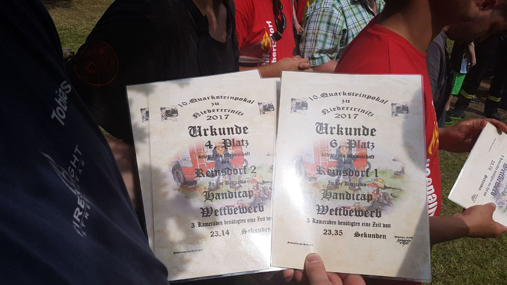 Nach dem regulären Wettkampf fand, wie in jedem Jahr, der Handicap-Lauf statt. Hier startete Reinsdorf nochmal mit zwei 3-Mann-Mannschaften. Die erste Mannschaft erreichte hier nach Abzug der Toleranz eine Zeit von 23,35 Sekunden. Die zweite Mannschaft konnte dies sogar nochmal überbieten und schaffte 23,14 Sekunden. Damit sicherten sich die Reinsdorfer in der Handicap-Wertung den 4. und 6. Platz.