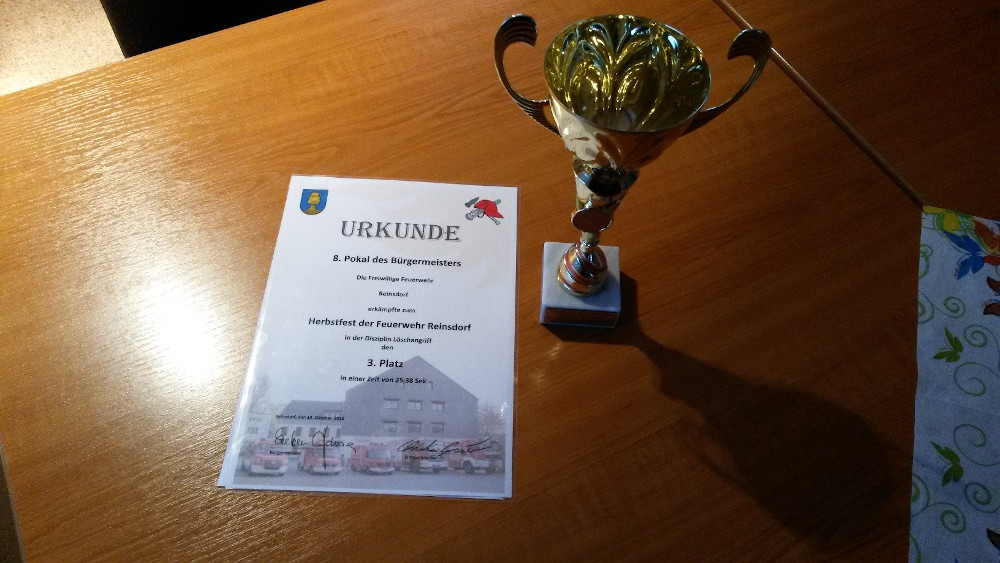 Zu unserem traditionellem Herbstfest in Reinsdorf startete die Wettkampfmannschaft im Wettkampf um den 8. Pokal des Bürgermeisters. Angetreten waren bei spätsommerlichem warmen Wetter 9 Mannschaften. Wir erliefen auf heimischen Boden eine Zeit von 25,38 Sekunden und konnten uns damit hinter Großpillingsdorf und Niedercrinitz den 3. Platz sichern.